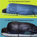 Pad attachment system using elastic straps and clips on each side of the quilt to keep it secure on a sleeping pad and lock out drafts on cold nights.